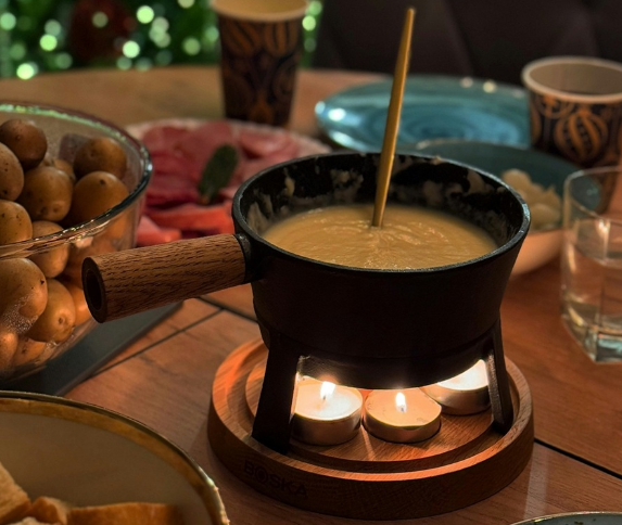 Hausfondue mit eingelegtem Gemüse Hausgemachtes Fonduebrot